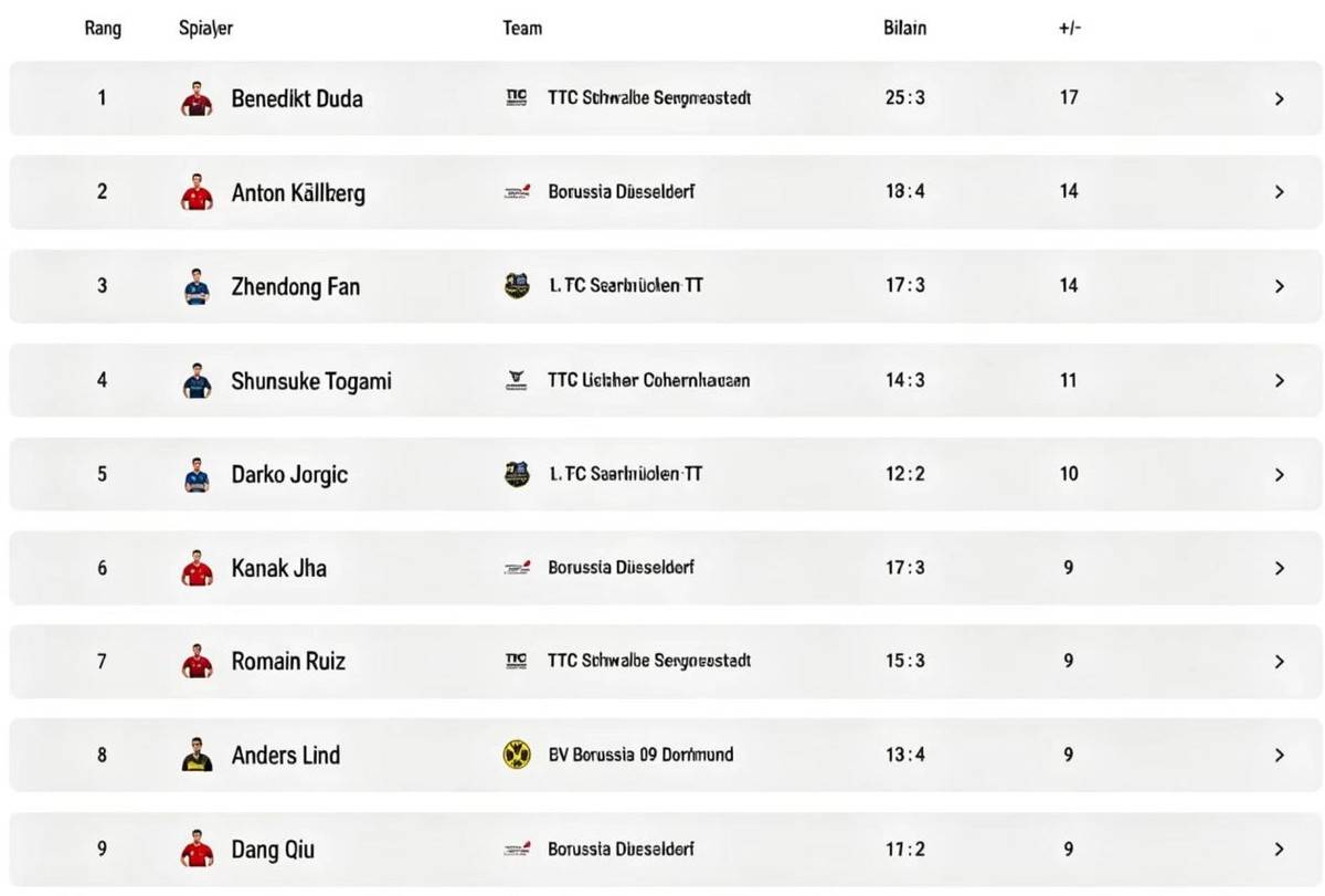 在运动员排名榜中,杜达25胜3负排名第1,安东18胜4负排名第2,樊振东17胜3负排名第3。户上隼辅、达科、卡纳克、鲁伊斯、林德、邱党分列其后。